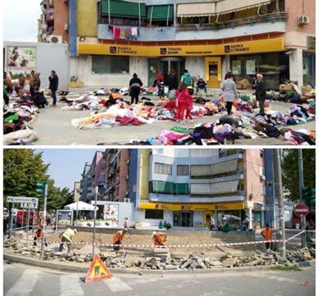Kryetari i Bashkisë së Tiranës, Erion Veliaj, përmes një foto në rrjetin social “Facebook” tregon pamje të ndërhyrjes së punonjësve të bashkisë dhe një tjetër pamje kur ky shesh përdorej si treg për rroba të përdorura.