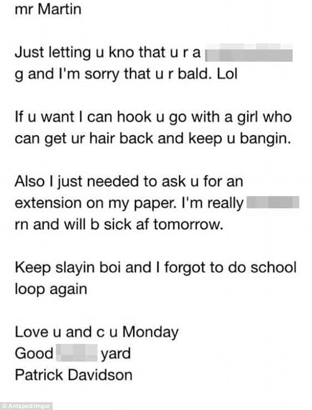 I riu pas një nate të kaluar duke pirë, i dërgoi një e-mail mësuesit të tij, zotit Martin plot me fyerje.