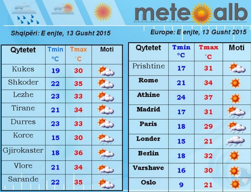 Ishujt Britanikë dhe brigjet perëndimore të Europës do të dominohen nga vranësira të shoqëruara me stuhi ere dhe rrebeshe shiu. Po ashtu, me vranësira dhe shira të herë pas hershëm paraqitet Italia Jugore dhe pellgu i detit Egje. Kthjellime dhe temperatura të larta do të dominojnë Europën Qendrore dhe Lindjen e kontinentit Europian./a.y/noa.al