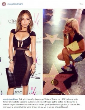 “Tek ylli i Jennifer Lopez në Walk of Fame në LA! E adhuroj këtë femër dhe artiste super të suksesshme që i tregon gjithë botës me bukurinë e talentin e jashtëzakonshëm se mosha është gjendje dhe energji dhe jo numër! Për më tepër e kam idhull se kemi lindur në një vit e në një shenjë( Luani).”, shkruan Manjola.