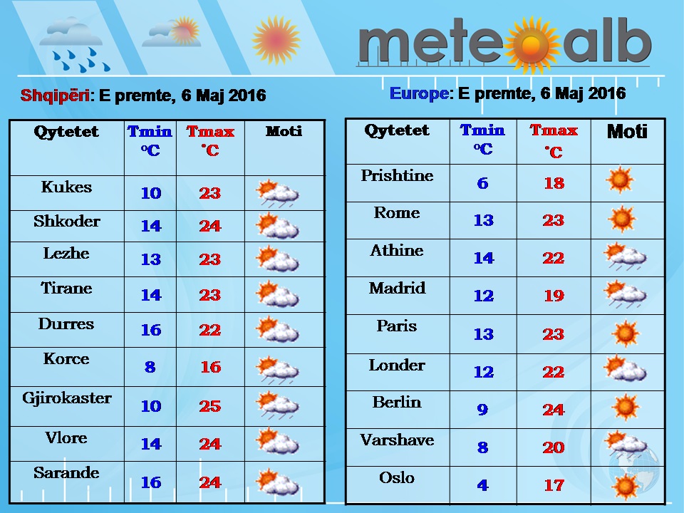 Ndërsa, zhvillimi i një qendre me presion të ulet atmosferik në jugperëndim të Europës do të kushtëzojë vranësira dhe shira në gadishullin Iberik. Po ashtu, me vranësira dhe shira do të jetë moti për Evropën juglindore./b.l/noa.al/