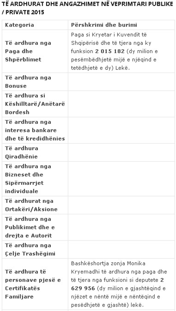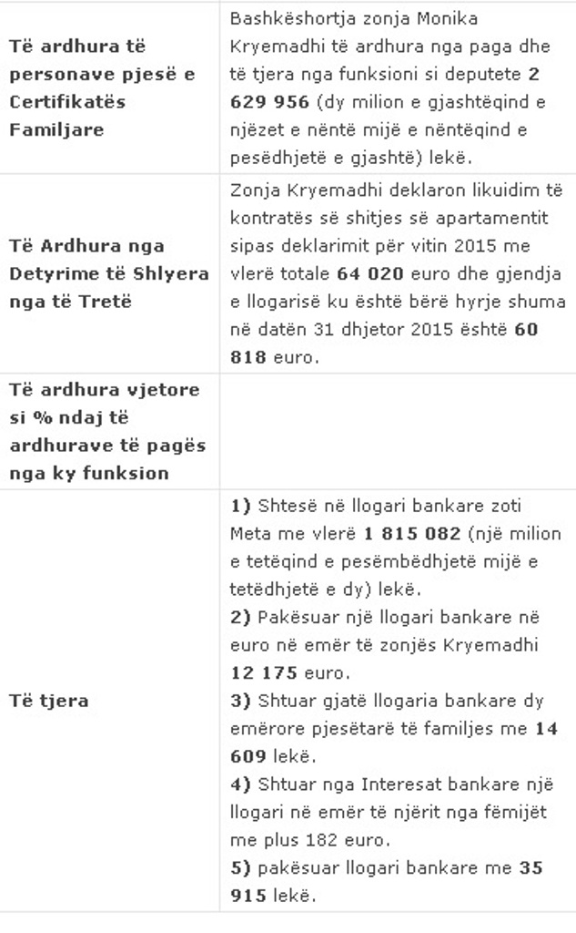 Kështu, sipas dokumentit, kreu i Kuvendit ka rreth 20 milionë lekë të vjetra të ardhura vetëm nga funksioni si kryetar i Kuvendit. Ndërsa bashkëshortja, Monika Kryemadhi ka të ardhura nga paga dhe të tjera nga funksioni si deputete rreth 26 milionë lekë të vjetra në vit./noa.al/