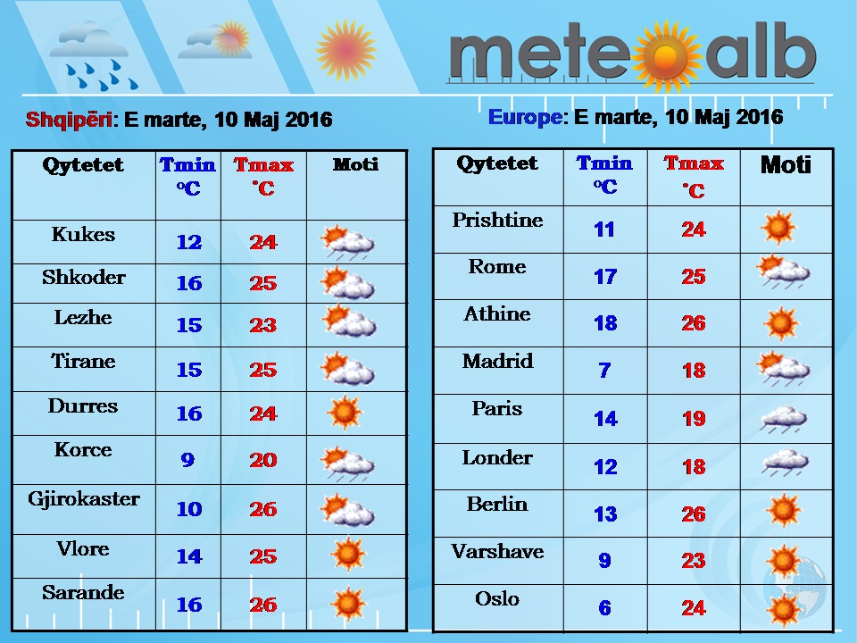 Ndërsa, me kushte të qëndrueshme atmosferike do të paraqitet situata e motit për vendet mesdhetare, gadishullin e Ballkanit, Evropën veriore dhe atë Lindore ku moti i kthjellët dhe temperaturat e larta do të jenë dominante./b.l/noa.al/