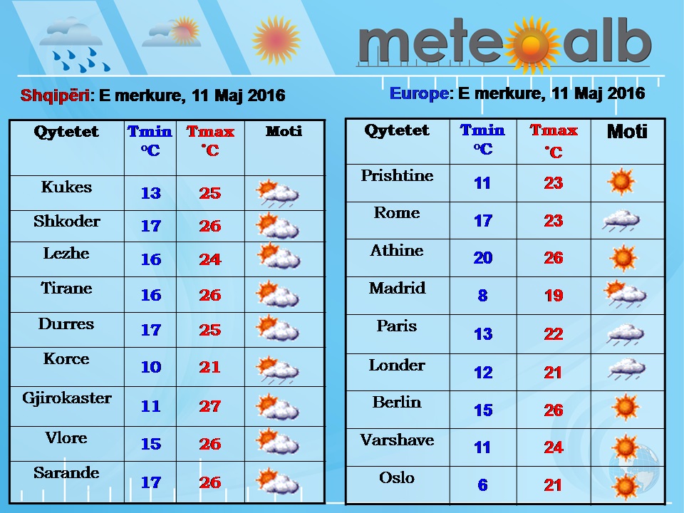 Po ashtu, me rrebeshe shiu do të jetë situata meteorologjike për një pjesë të gadishullit të Ballkanit ku nuk përjashtohet edhe mundësia për breshër. Ndërsa, moti i kthjellët dhe temperatura relativisht të larta do të jetë prezent për Europën Lindore, gadishullin Iberik, ishujt britanike si edhe vendet Skandinave./b.l/noa.al/