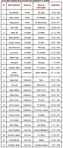 Në pozicionin e mesfushorit janë thirrur Ergys Kaçe, Andi Lila, Amir Abrashi, Taulant Xhaka, Herolind Shala, Ermir Lenjani, Migjen Basha, Odise Roshi dhe Burim Kukeli. /a.y/noa.al/