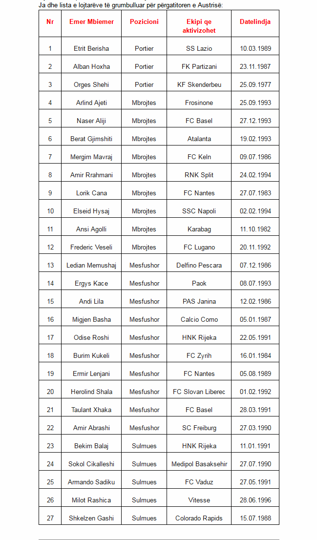 FSHF-ja ua ka nisur ftesat lojtarëve kuqezinj prej disa ditësh. Bëhet fjalë për 23 + 4 emra, që do t’i ketë nën urdhra De Biazi në Austri, ku do të “karikojë bateritë” e kombëtares shqiptare për finalet e “Euro 2016”. 23 kuqezinj do të federohen në UEFA deri më 1 qershor, si pjesë e Shqipërisë në “Euro 2016”, ndërsa 3 të tjerë do të jenë gati, në rast të ndonjë të papriture të këndshme. Amir Rrahmani, fjala vjen, e ka të qartë mospjesëmarrjen në Francë, por do të jetë i gatshëm, ashtu si edhe tre lojtarë të tjerë, në rast të ndonjë të papriture, larg qoftë ndonjë dëmtim. Ne zbuluam se Naser Aliji nuk kishte marrë ftesë, por do të diskutojë shanset me ndonjë tjetër në Austri. Po kështu, edhe Milot Rashica e Frederik Veseli. Në zborin stërvitor disaditor në Austri, si pjesë e kombëtares shqiptare, debutuese në “Euro 2016”, do të jenë emrat e mëposhtëm: