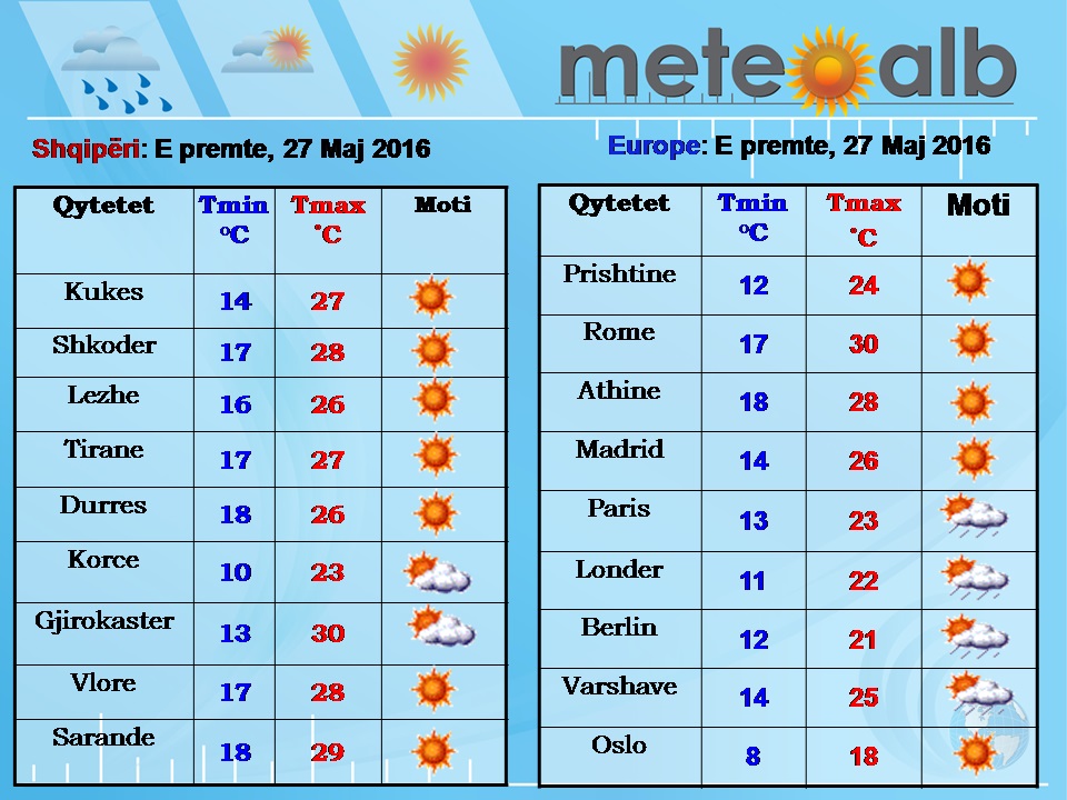 Sipas MeteoAlb edhe gjatë ditës së premte, temperaturat e ajrit do të pësojnë rritje si në vlerat e mëngjesit edhe në të mesditës duke shkuar deri në 30 gradë celcius. Era do të fryjë e lehtë si në tokë dhe në det me shpejtësi 15 km/h nga drejtimi jugperëndimor duke bërë që edhe deti të jetë kryesisht i qetë.