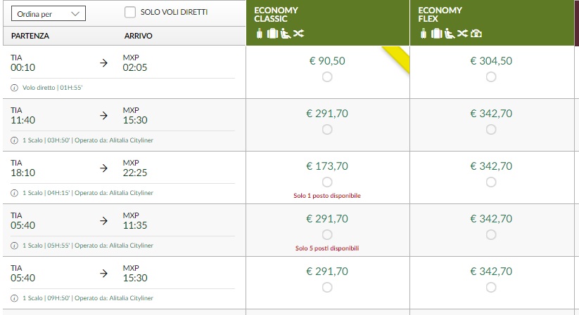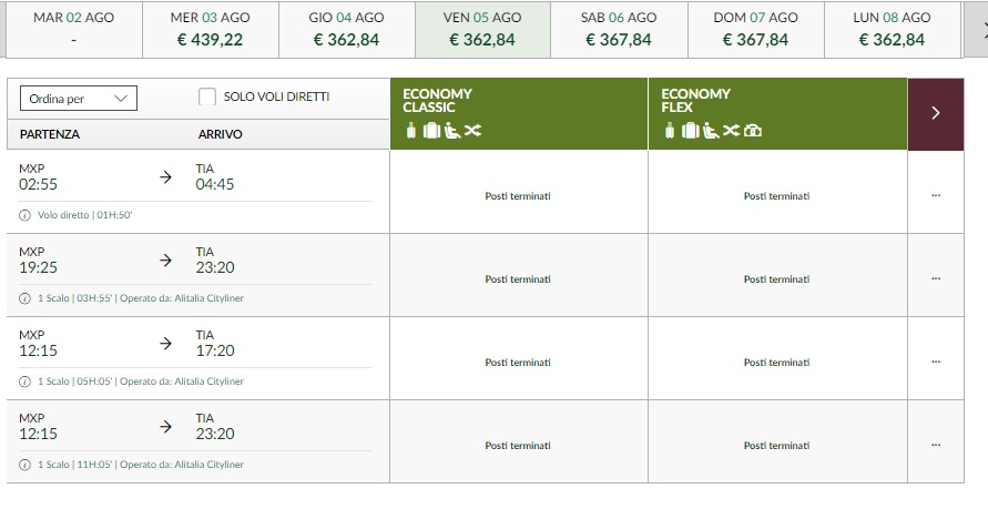 Me Alitalia kushton duke filluar nga 381 euro deri në 655 euro në varësi të orarit të fluturimit. Vetëm se të gjitha biletat e kthimit janë shitur sikundër shihet në imazhet.
