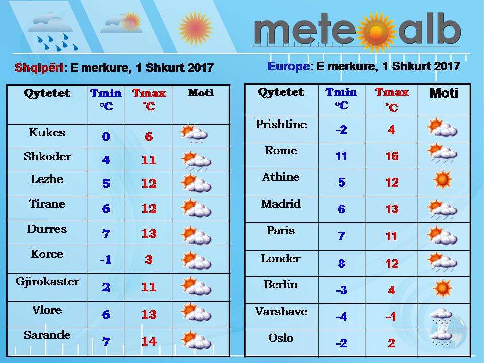 Parashikohet që edhe pasditja të vijojë me të njëjtat kushte atmosferike duke bërë që i gjithë territori i vendit të dominohet nga alternime kthjellimesh dhe vranësirash të herë pas hershme.