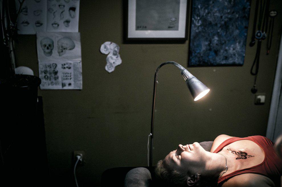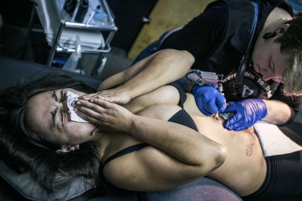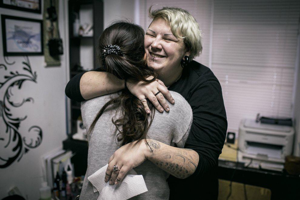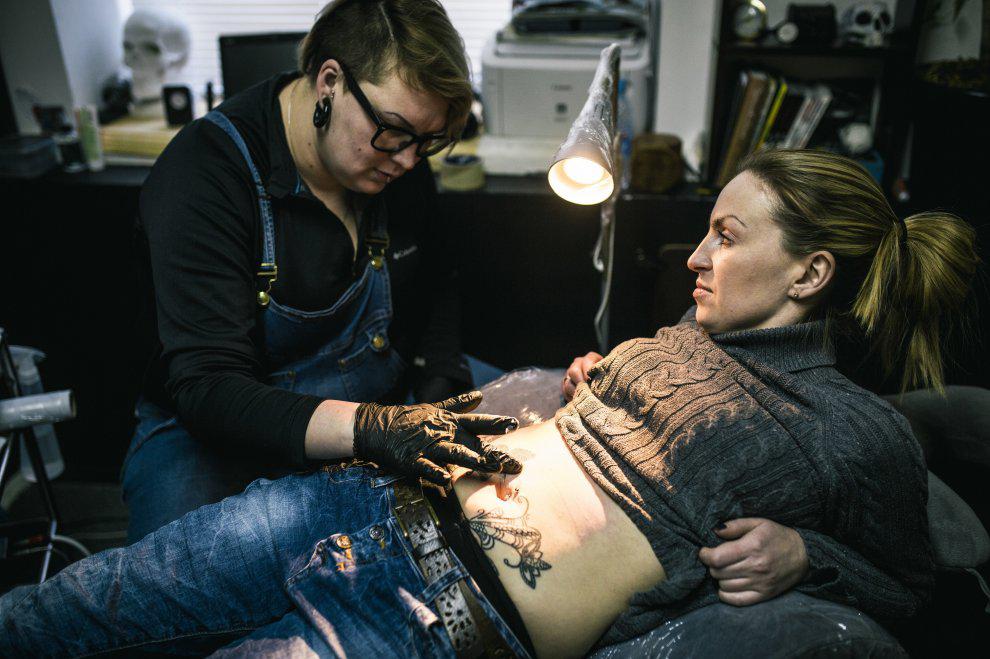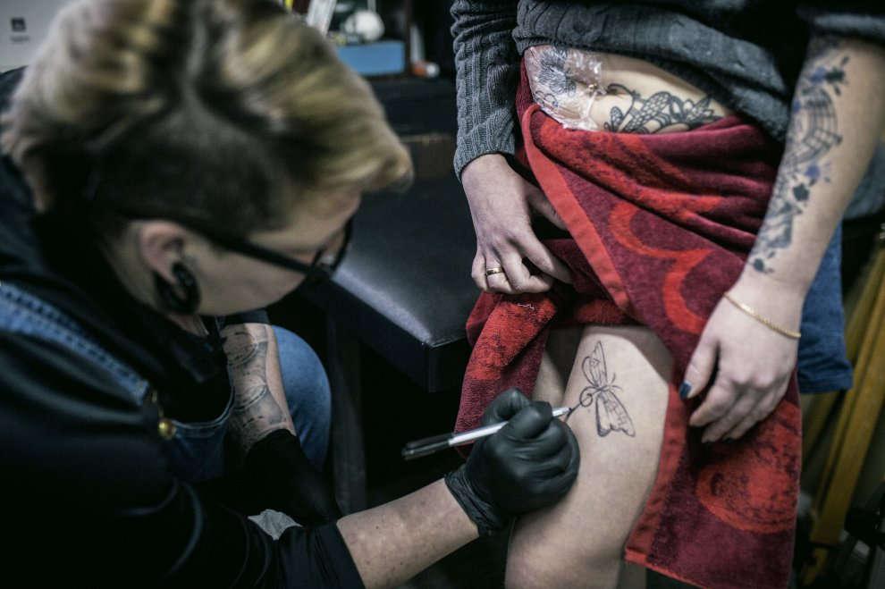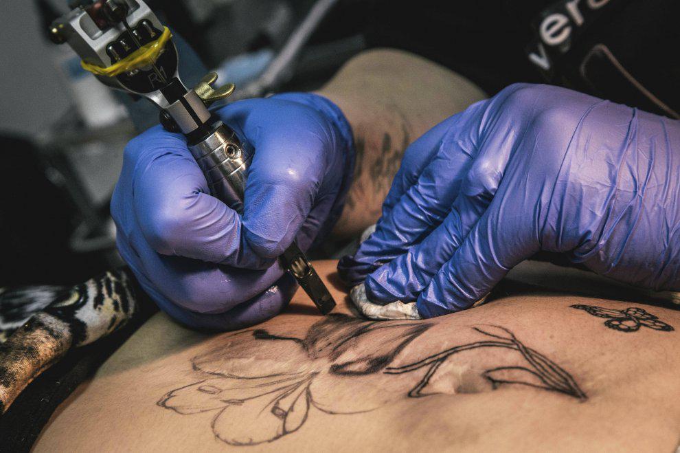 Lule dhe flutura të bëra tatuazh sipër shenjave të lëna nga dhuna në familje, në tentativë për të harruar traumat e lidhjeve me partnerët e dhunshëm.