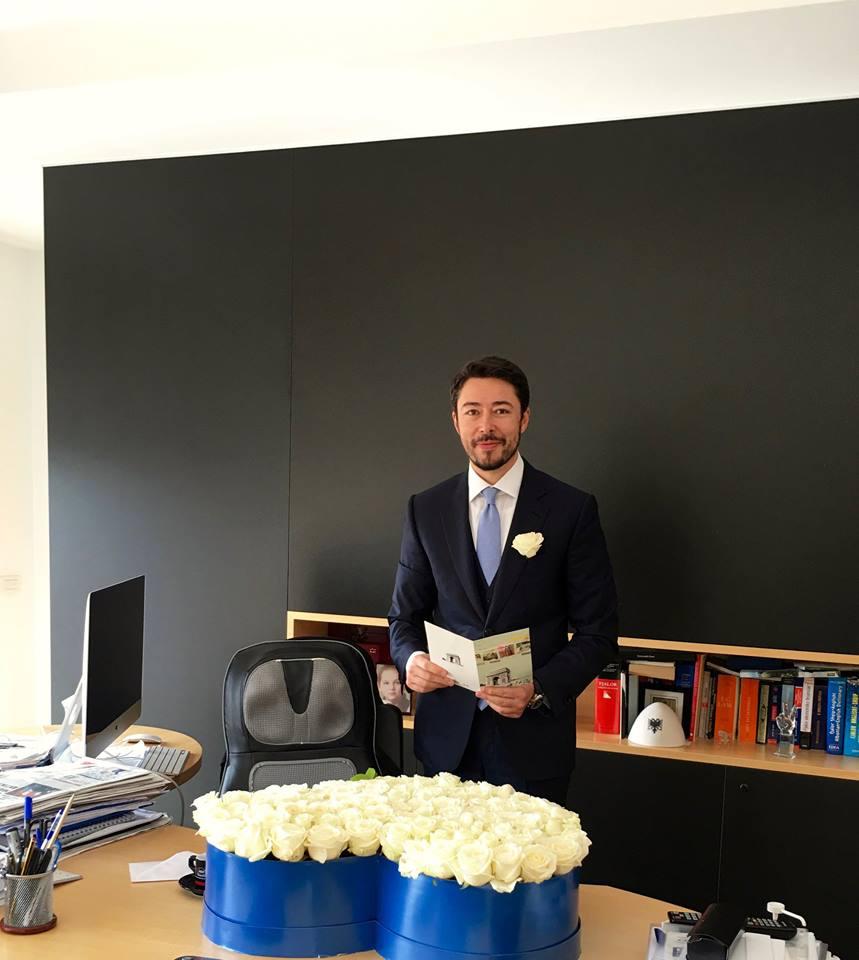 Zeni ka publikuar një fotografi në Facebook ku shihet në zyrën e tij me një buqetë të madhe me lule të bardha në formë zemre mbi tryezë.