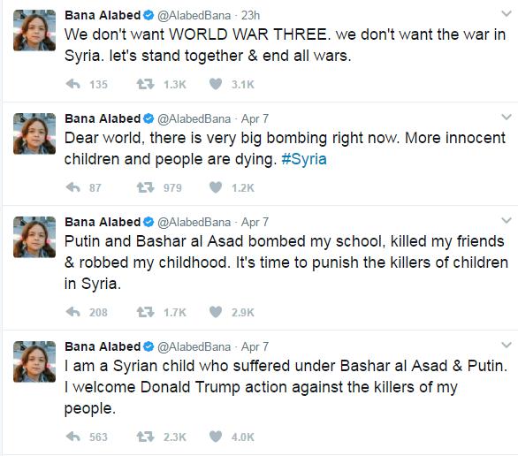 Refugjatja siriane Bana Alabed shkroi në Tëitter disa orë pasi SHBA lëshoi 49 raketa ‘Tomahavk’, për të treguar mbështetjen e saj.