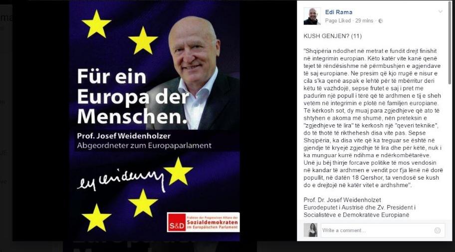Në garën e nisur me kreun e opozitës Lulzim Basha lidhur me rubrikën "Kush gënjen?", kreu i qeverisë, Edi Rama ka përdorur deklaratën e austriakut që është njëkohësisht Zv. President i Socialistëve e Demokratëve Europianë.