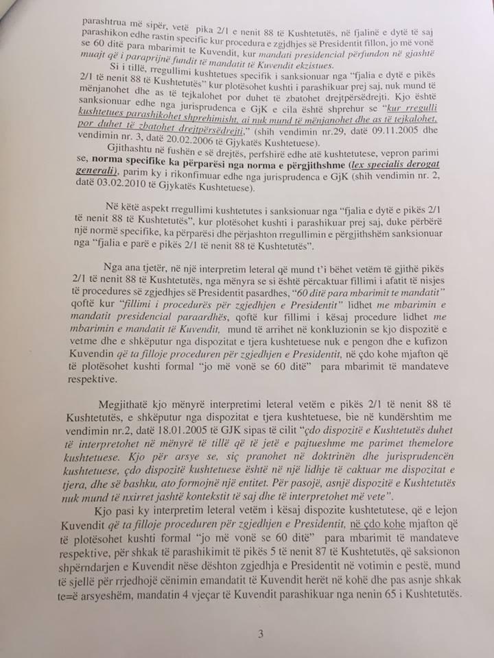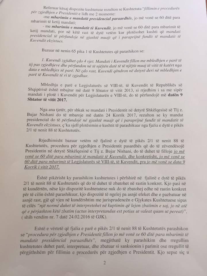 Procedura për zgjedhjen e Presidentit fillon jo më vonë se 60 ditë para mbarimit të mandatit presidencial paraardhës. Kur mandati presidencial përfundon në gjashtë muajt që i paraprijnë fundit të mandatit të Kuvendit ekzistues, procedura për zgjedhjen e Presidentit fillon jo më vonë se 60 ditë para mbarimit të mandatit të Kuvendit", thuhet në letër. /b.l/noa.al/