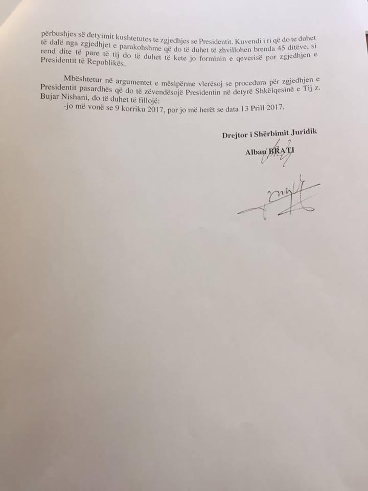 Drejtori i Shërbimit juridik të Kuvendit, Alban Brati i ka dërguar një letër kryetarit të Kuvendit, Ilir Metës për procedurat dhe afatet e zgjedhjes së Presidentit të Republikës. Në letër thuhet se mandati i presidentit Bujar Nishani mbaron më 24 korrik 2017. Procedurat nisin 60 ditë para mbarimit të Kuvendit.