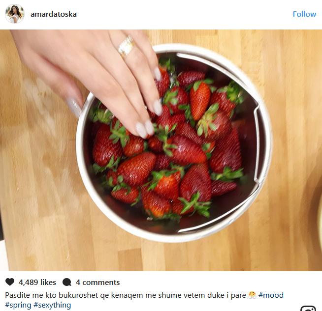 Në një fotografi të publikuar në rrjetet sociale, ajo tregon se i ka debolesë luleshtrydhet.