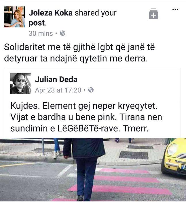 “Dy fjale per anonimen Joleza Koka. Kjo cuca me quan derr, sepse jam kunder manifestimeve dhe aq me teper jam shume kunder martesave te te njejtes gjini. Nese te reklamosh apo te mbrosh familjen tradicionale mes nje gruaje dhe nje burri te ben derr, po une jam nje derr. E kuptoj shume mire pse te dukem derr, sepse nuk jemi njesoj. Ti moj çike, kur zgjohesh nga gjumi, nuk mban mend vendin se ku ke rene per te fjetur. Kaq besoj mjafton per te bere dallim mes nje derri si une dhe nje tyryfyle si ti. Nuk po e zgjas, se me duket te dhashe rendesi me shume seç duhet, por meqe te pelqen dhe e mbeshtet kaq shume komunitetin LGBT, shpresoj te te shoh ne maje te biçikletes diten e manifestimit, une do jem diku aty ne cep duke duartrokitur vajzen kompleksive qe ben xhiro sa ne nje biçiklete ne tjetren. P.s. Ik tashti se te bera te famshme. Puç puç.”-/a.k/noa.al/