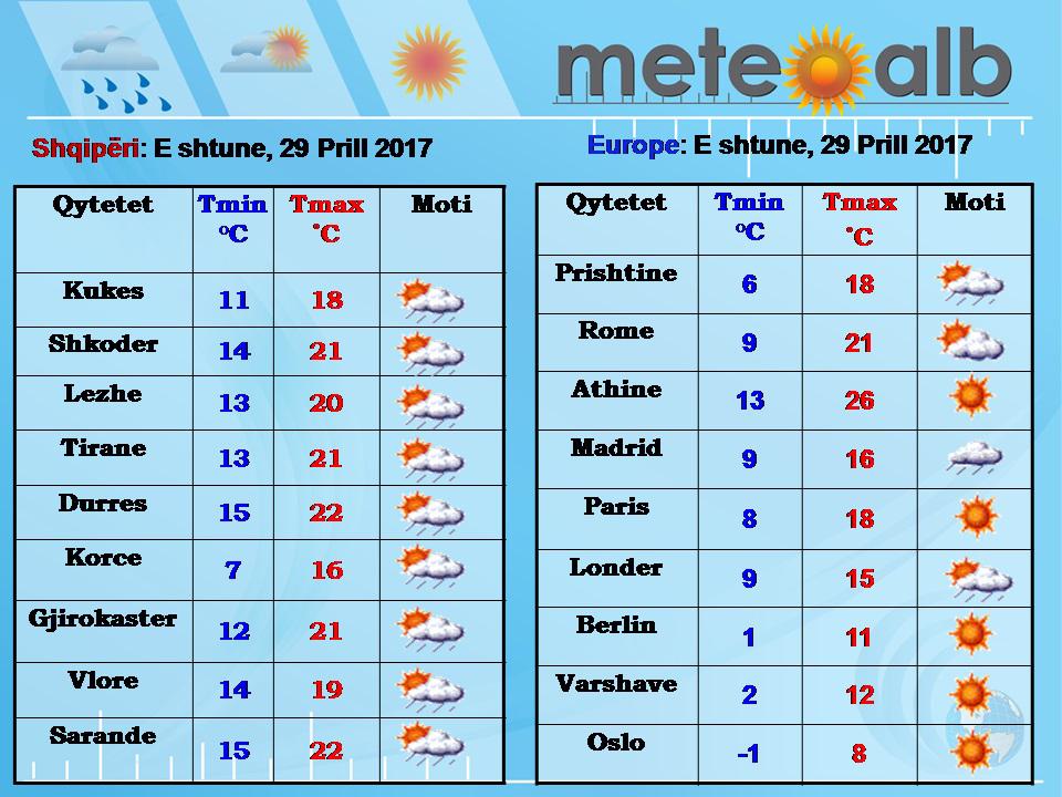Temperaturat e ajrit do të qëndrojnë konstante në vlerat minimale ndërsa mesdita do të sjellë rënie të ndjeshme të tyre deri në 5 gradë C. Era do të fryjë mesatare në tokë dhe e fortë në det duke arritur shpejtësinë 45 km/h nga drejtimi Jugperëndimor, kjo do të bëjë që në Adriatik dhe Jon të gjenerohet dallgëzim mbi 3 ballë.
