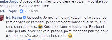 Rama: Qetesohu Jorgo, ne me paç votuar me ke votuar per kete detyren qe kam tani, jo per president konsensual se mua PD s’me sheh dot me sy. Keshtu qe kemi zgjedhur nje President edhe per ata jo vec per vete, prandaj po te mendosh pak me holle e kupton qe s’ka arsye te trashesh zerin./a.k/noa.al/
