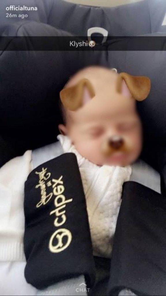 Në profilin e saj në Snapchat, Tuna ka publikuar një foto në të cilën shihet se si argëtohet me djalin, duke i vënë efektet e Snapchat në fytyrë dhe e quante ‘Klysh’.