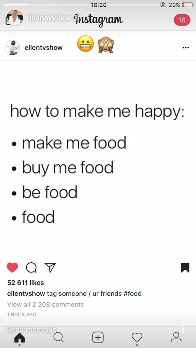 Ajo së fundmi ka publikuar në Insta Story një postim ku tregon se vetëm me ushqim mund ta bëni atë të lumtur.