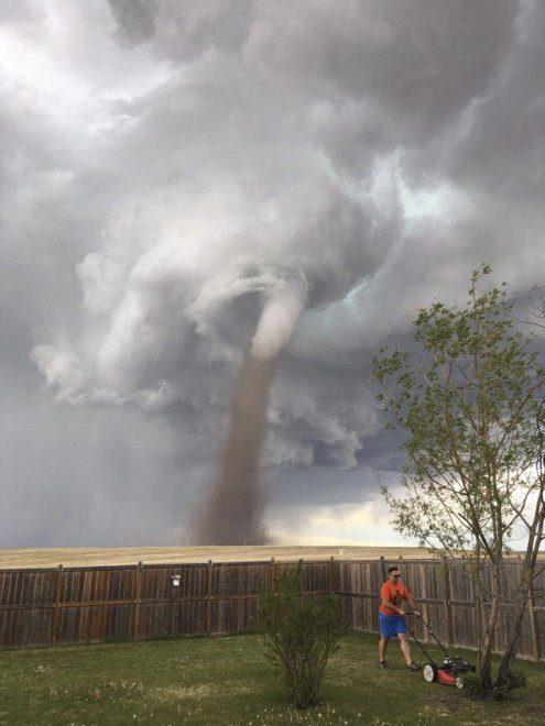 Një burrë i veshur me një bluzë ngjyrë portokalli që korr qetësisht barin në kopshtin para shtëpisë së tij. Duket si një foto e zakonshme, nëse nuk do të ishte për tornadon e tmerrshme që afrohej pas shpinës së tij.