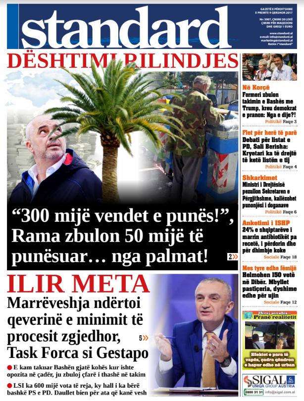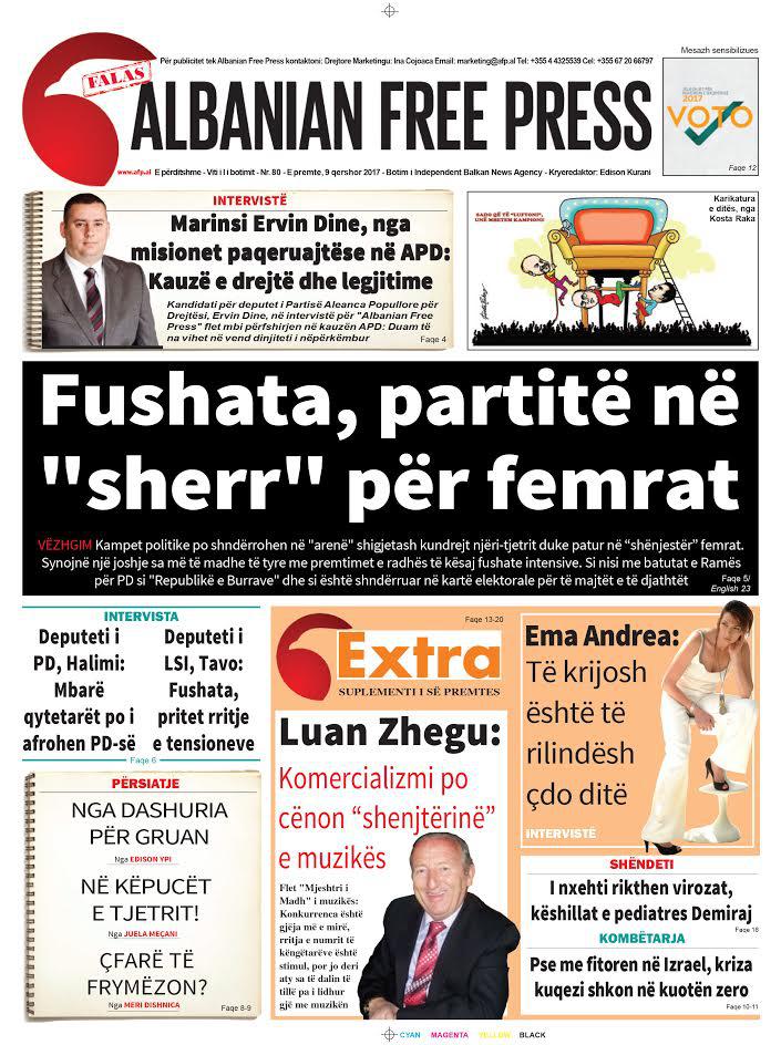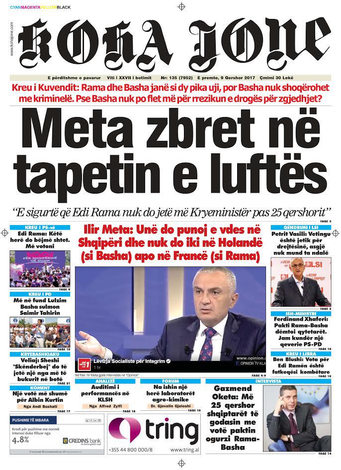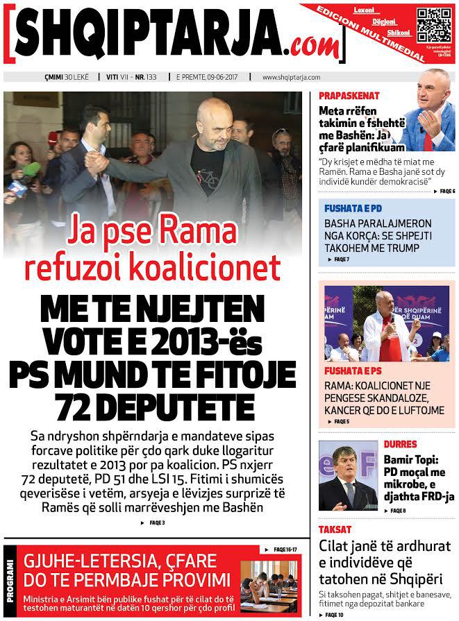 Të nderuar lexues, kjo është një pasqyrë e faqeve të para të disa prej gazetave kryesore, për ditën e premte, 9 qershor 2017.