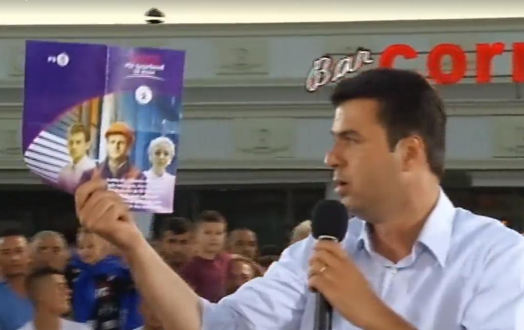Basha nxori një broshurë të shpërndarë sipas tij nga Partia Socialiste, ku në faqe të parë janë tre persona që supozohet se janë të punësuar nga programi i ‘Rilindjes’.