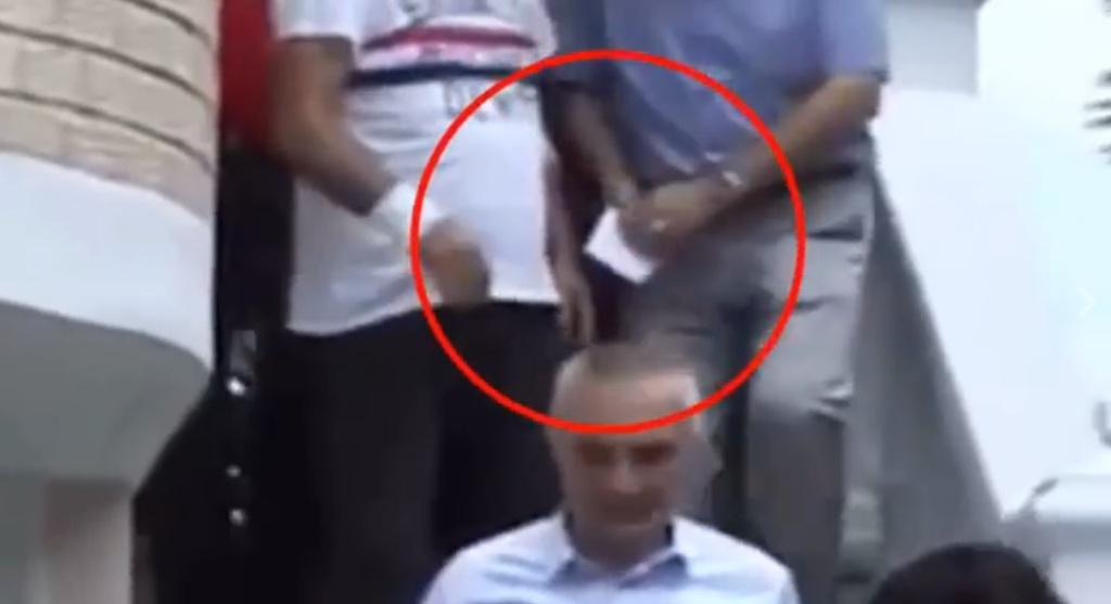 Në të shihet kandidati për deputet i Lëvizjes Socialiste për Integrim për Lezhën, Viktor Tushaj, i cili i fut një zarf në xhep një simpatizanti të LSI, Gjovalin Gjini i cili u dhunua të premten mbrëma.