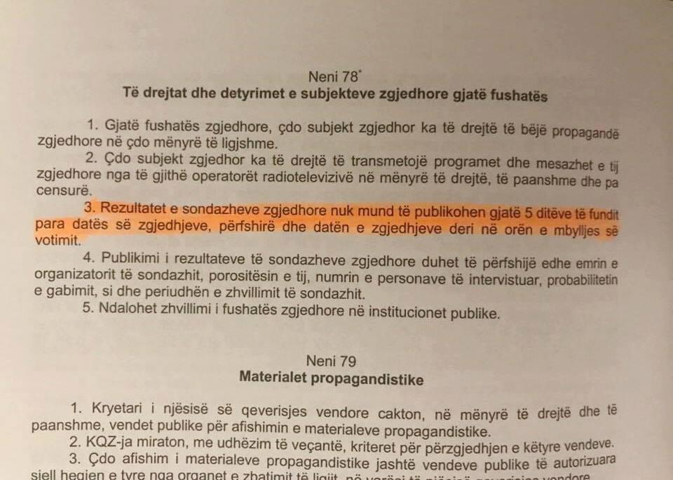 Rezultatet e sondazheve zgjedhore nuk mund të publikohen gjatë ditëve të fundit para datës së zgjedhjeve, përfshirë dhe datën e zgjedhjeve deri në orën e mbylljes së votimit”, shkruan Hoxha. /b.l/noa.al/