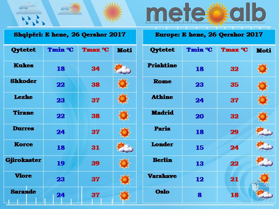 Sipas MeteoAlb, temperaturat e ajrit do të mbeten problematike edhe gjatë ditës së hënë ku në shumë zona do të jenë 38 – 39 gradë C.