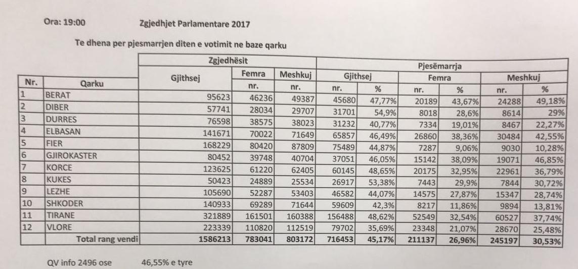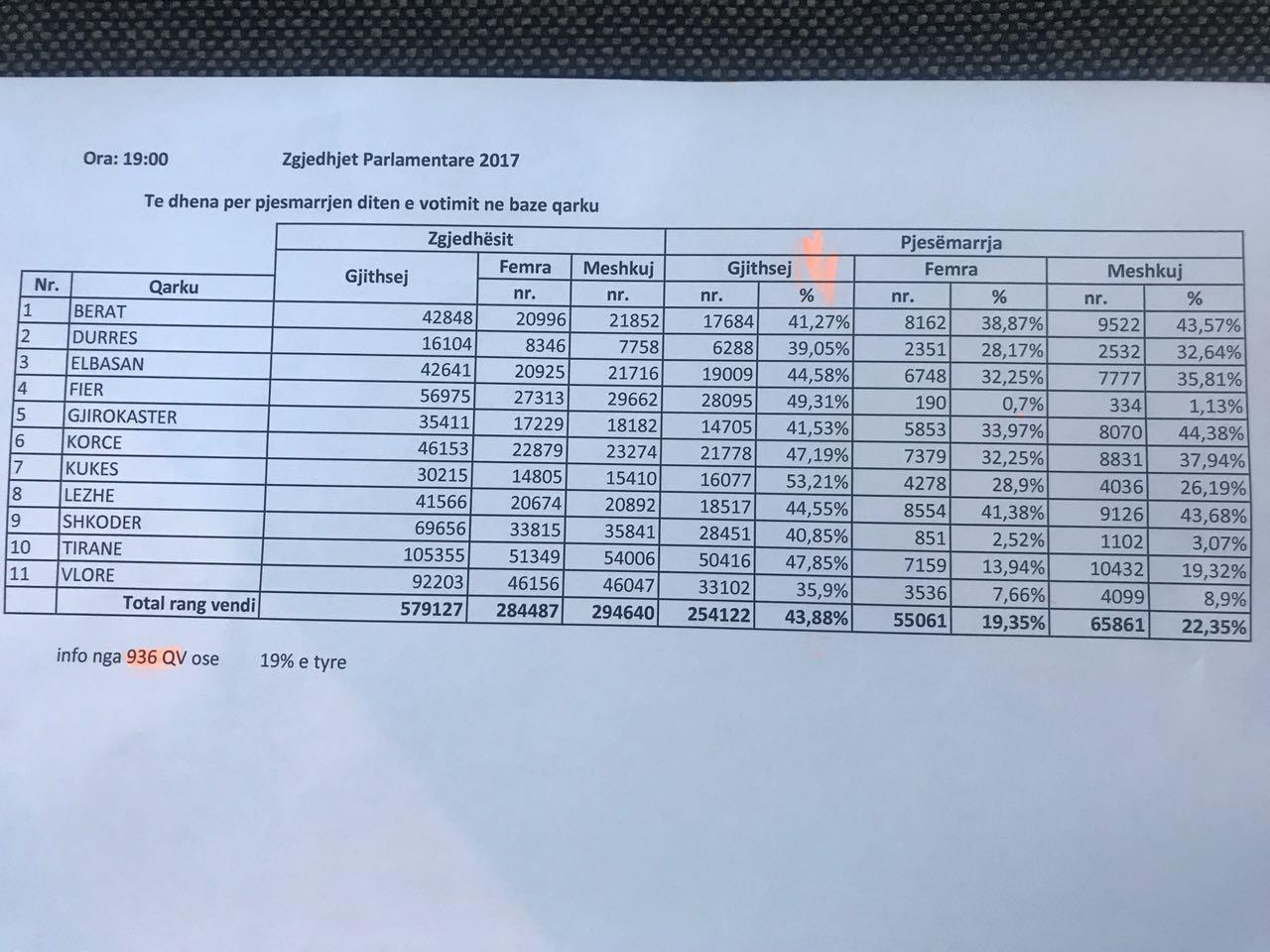 “55 % e Qendrave të Votimit kanë dhënë informacion lidhur me pjesëmarrjen në votime. Nga këto QV pjesëmarrja në votime ka qenë 45. 7 %”, deklaroi Hoxhaj.