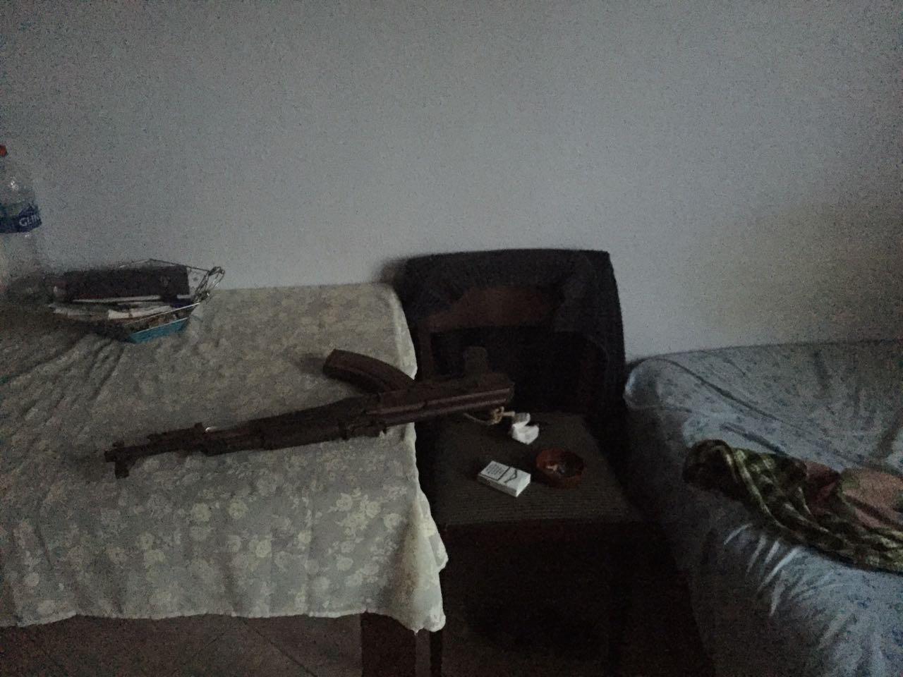 Gjatë kontrollit të ushtruar në ambientin ku ai ishte fshehur u gjetën dhe sekuestruan në cilësinë e provave materiale një armë zjarri automatik model 56, kalibër 7.62 mm;