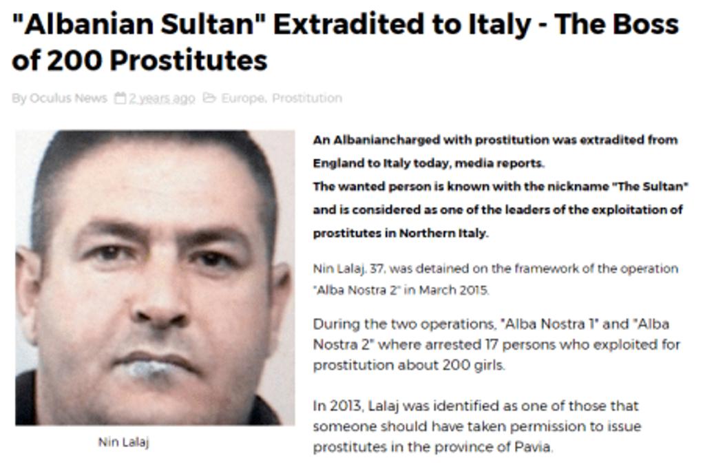 17 persona u arrestuan pasi shfrytëzonin për prostitucion rreth 200 vajza. Mediat e huaja shkruajnë se kryesori i grupit ishte Lalaj. “Atij duhet t’i merrje leje për të pasur prostituta në Pavia, në vitin 2013”.