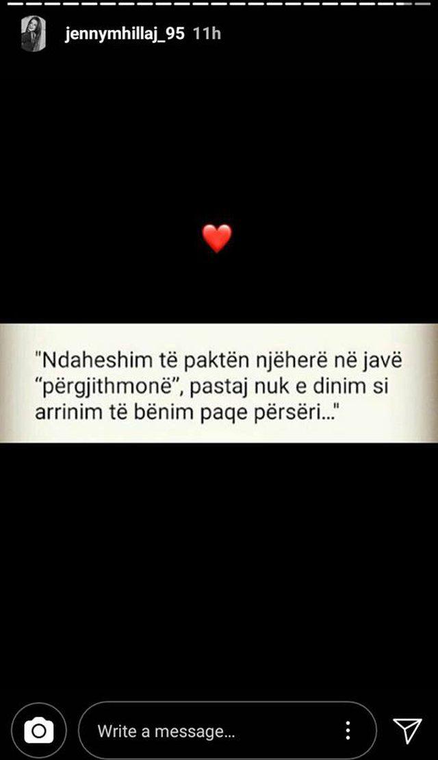 "Ndaheshim të paktën një herë në javë, pastaj nuk e dinim si arrinim të bënim paqe përsëri", shkruan Xheni teksa ka vendosur edhe një emoji zemër.