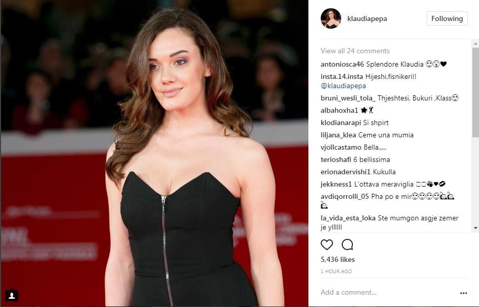 Këtë herë, Klaudia Pepa ka veshur një fustan të zi, me dekolte të theksuar, me një zinxhir si dekoracion në pjesën e përparme, i gjatë dhe paksa i hapur.