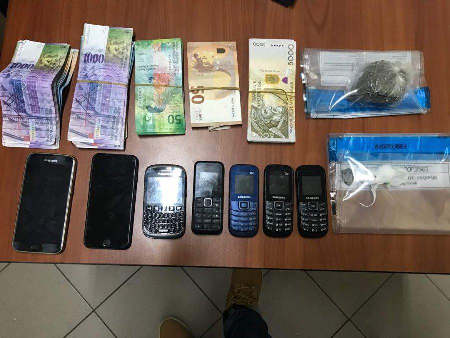 Në Rrugën “Hoxha Tasim”, është ndaluar automjeti i markës “Audi”, me drejtues shtetasin Gentian Kalemi, ku nga kontrolli në brendësi të automjetit është konstatuar dhe sekuestruar në cilësinë e provës materiale një dozë me lëndë të dyshuar narkotike e llojit kokainë, si dhe gjatë kontrollit të banesës i është gjetur dhe sekuestruar në cilësinë e provës materiale 90.2 gramë fara të dyshuara narkotike të llojit kanabis sativa, si dhe shumat monetare 36440 Franga Zviceriane, 170 Euro, 100 Cent Bolivian, 5 Leji Rumun, 77 000 Lekë.