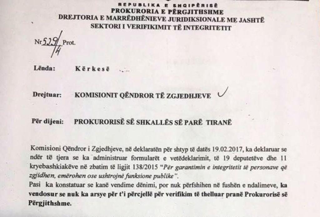 Vetëm një ditë më pas, kryetari i KQZ-së në atë kohë, Denar Biba i ka kthyer përgjigje Prokurorisë me shkresën e datës 22.02.2017, me nr/prot 1218/1, ku i thotë se; “…KQZ- ka konstatuar me bindje të plotë se dhënat e deklaruara të funksionarëve publik, sipas deklaratës për shtyp të datës 19.02.2017, nuk përfshihen Brenda sferës së ndalimeve të parashikuara nga neni 2 i ligjit 138/2015. Në vlerësim të KQZ të dhënat e disponuara nuk përbënin shkak për verifikim të thelluar nga Prokuroria e Përgjithshme”.