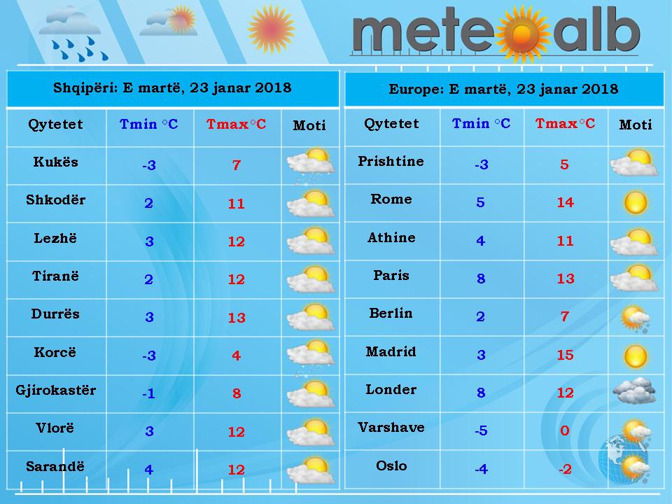 Era do të fryjë e lehtë deri mesatare, me shpejtësi 30 km/h nga drejtimi Verilindor ndërsa në det do të vijojë dallgëzimi 2 ballë.