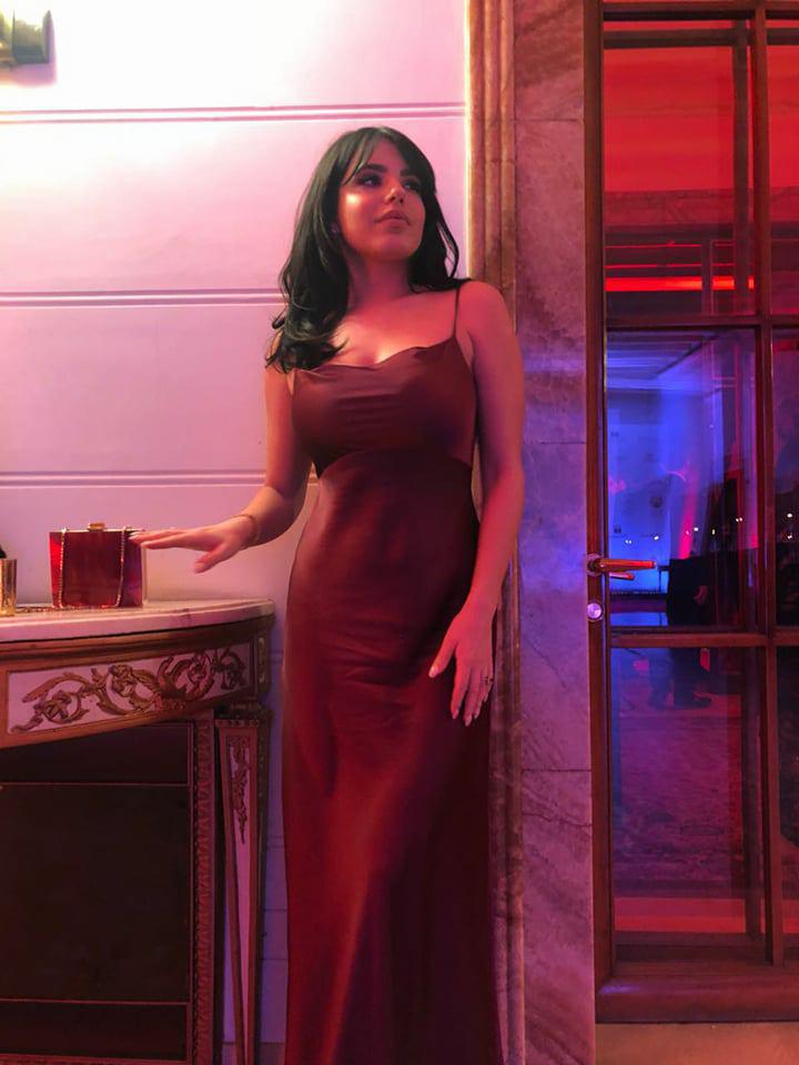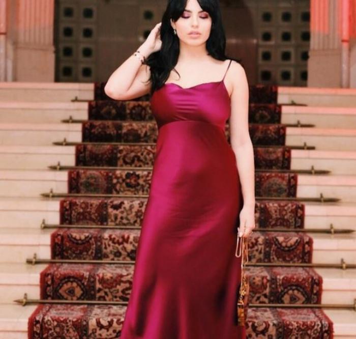 Në foto Armina e veshur me një fustan vishnje sateni, duket me barkun e rrumbullakosur, duke ngjallur kuriozitet tek ndjekësit e saj.