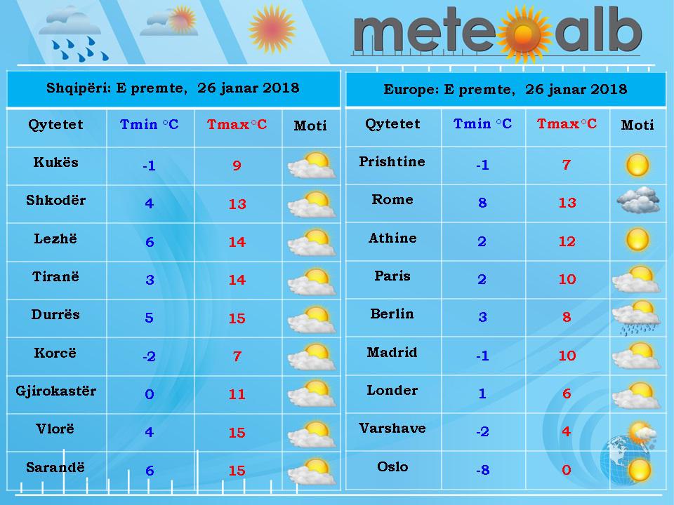 Sipas MeteoAlb, temperaturat e ajrit do të rriten me 1 – 2°C në të dy ekstremumet ditore, duke bërë që vlerat e tyre të luhaten nga – 3°C në 14 apo 15°C.