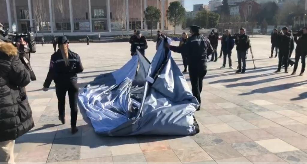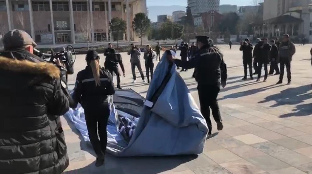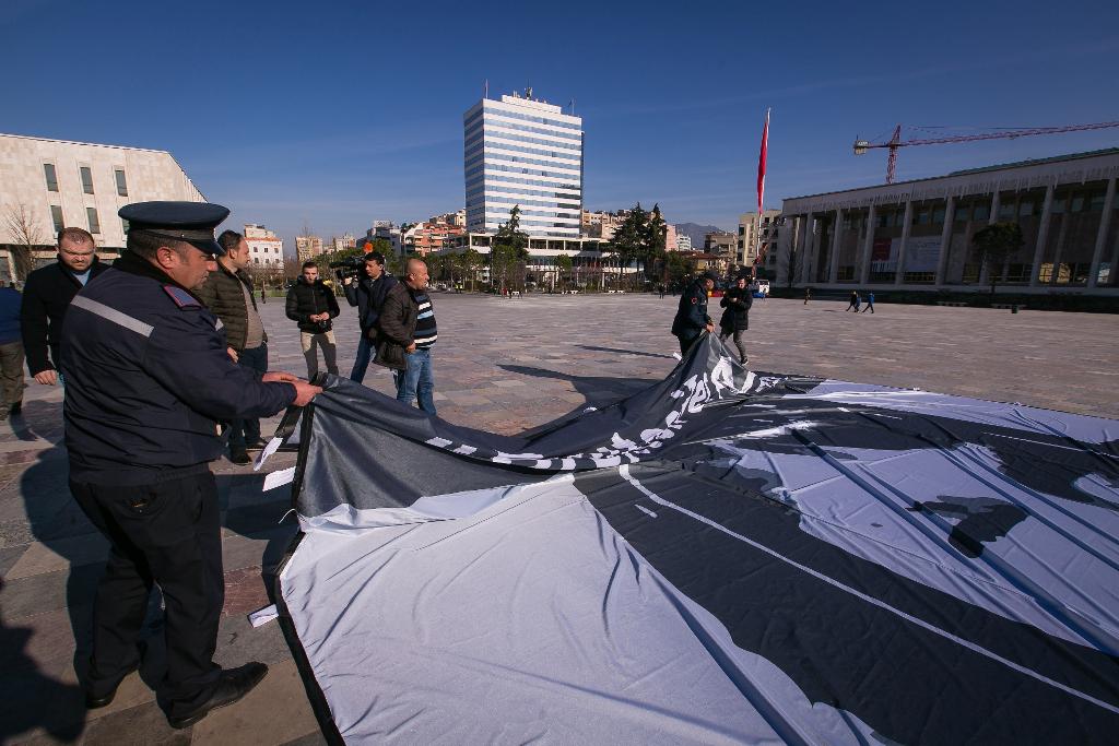 Ka qëndruar vetëm pak minuta pankarta e shpalosur në sheshin “Skënderbej”, nga protestuesit e opozitës.