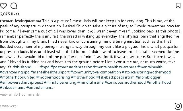 “Kjo është një fotografi që me shumë gjasa nuk do të zgjasë për shumë kohë. Kjo jam unë, në kulmin e depresionit tim pas lindjes. Kam fotografuar veten në këtë gjendje vetëm për ta kujtuar më pas se çfarë kam kaluar, nëse unë do ta kaloja këtë situatë.