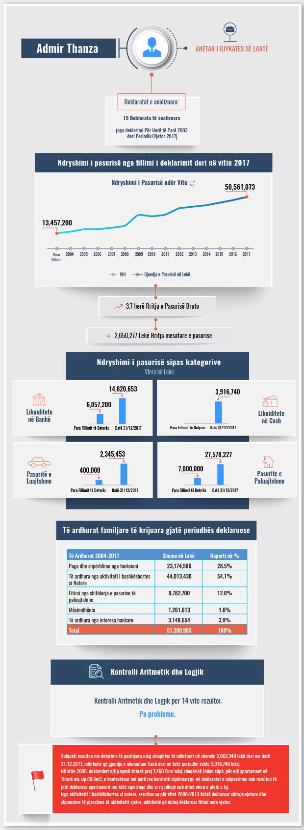 Të dhënat e analizuara nga BIRN tregojnë se gjyqtari Admir Thanza zotëronte një pasuri familjare me vlerë rreth 13.4 milionë lekë në vitin 2003-kur deklaroi për herë të parë pasurinë. Në fund të vitit 2017, vlera e pasurisë së deklaruar nga Thanza është rritur me tre herë, duke kapur vlerën e 50.5 milionë lekëve.