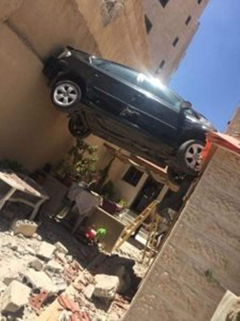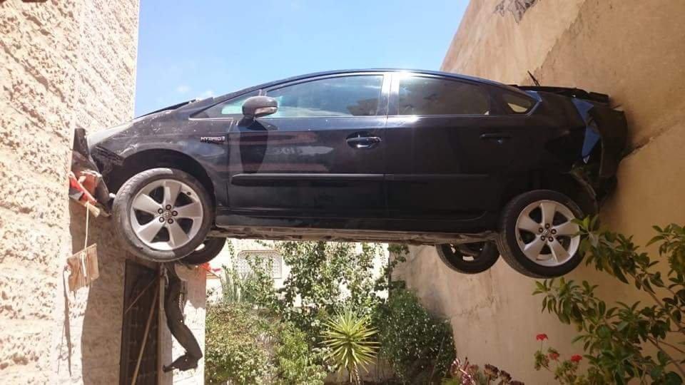 Por fati e deshi që makina të bllokohet mes murit të banesës dhe rrethimit, duke mbetur pezull në ajër, disa metra mbi tokë.