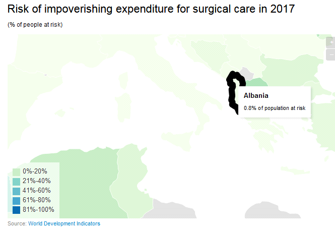Për Shqipërinë, shifrat sugjerojnë se kemi të bëjmë me 0.8% të popullsisë që nuk kanë qasje në shërbime kirurgjike për arsye financiare, gjë që mund të rezultojë në pasoja fatale për popullatën, shkruan ‘monitor’. Në Ballkan, panorama duket e ngjashme. Në Serbi, 0.5% e popullsisë nuk arrijnë të përballojnë një kujdes kirurgjik për shkak të kostove të larta. Po ashtu, 0.8% e popullsisë në Malin e Zi, nuk arrin që të përballojë këtë kujdes shëndetësor. Shifra më e lartë regjistrohet në Maqedoni, ku BB përllogarit rreth 7.9% të popullsisë në vështirësi financiare për të përballuar një ndërhyrje kirurgjike.