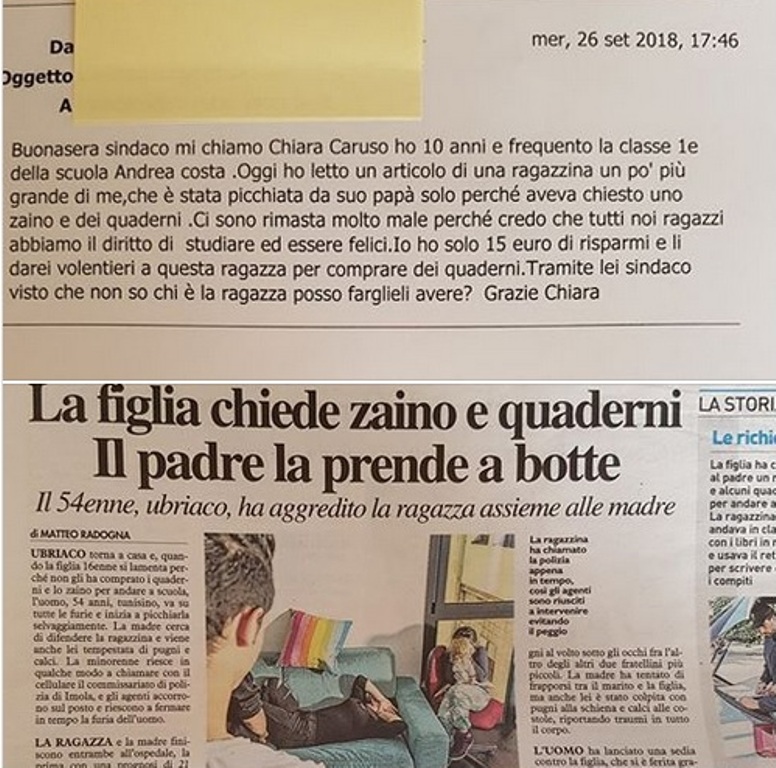 Ndërkohë një vajzë 10 vjeçe i shkroi kryebashkiakes së Imola, “Unë kam vetëm 15 euro kursim dhe do ja jepja me shumë dëshirë asaj vajze për të blerë fletore. A mund t’ia jap përmes teje?”