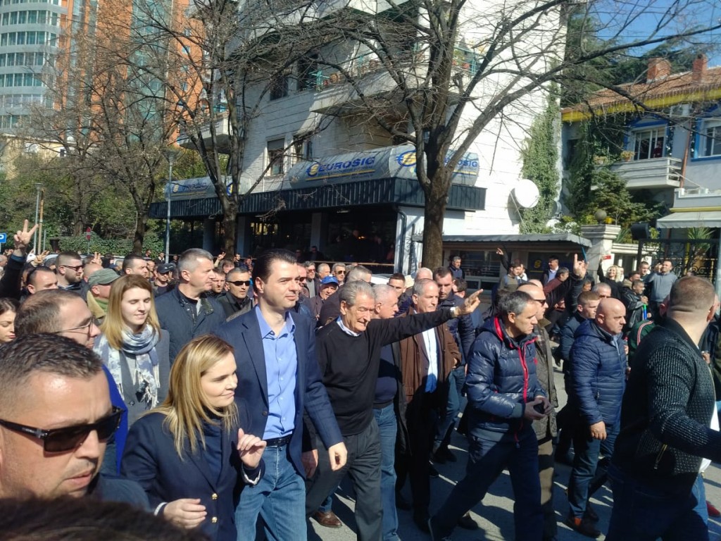Kryedemokrati Lulzim Basha dhe kryetarja e Lëvizjes Socialiste për Integrim, Monika Kryemadhi prijnë protestuesit drejt Kryesisë së Kuvendit, aty ku dhe pritet të bëjnë zyrtarisht dorëzimin e mandateve të deputetëve.