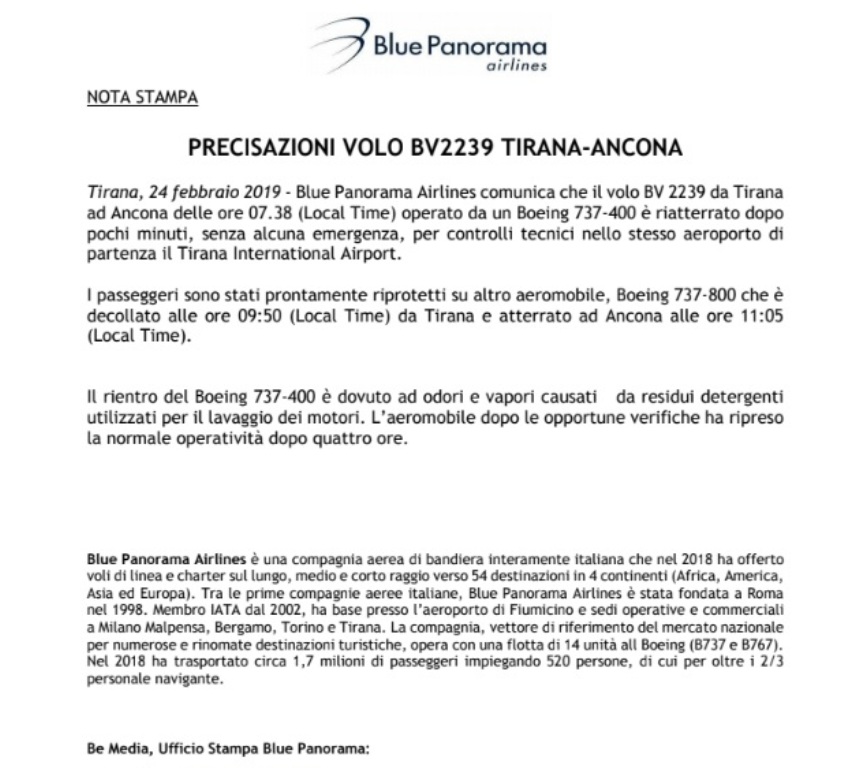 Kompania ajrore bën me dije se fluturimi BV 2239 i nisur nga Tirana drejt Ancona në orën 07.38, i kryer nga një Boeing 737-400 u kthye pak minuta më vonë, pa asnjë emergjencë, por për kontroll teknik, në të njëjtin aeroport ku ishte nisur, Tirana International Airport.