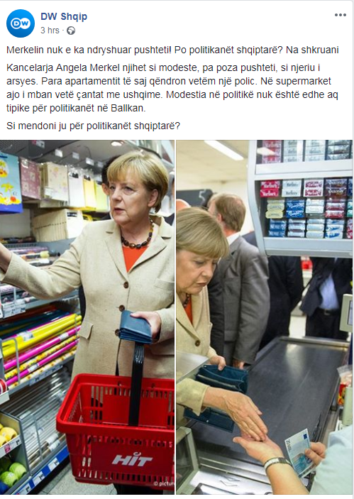 “Merkelin nuk e ka ndryshuar pushteti! Po politikanët shqiptarë?”. Kështu shkruan Deutsche Welle teksa poston dy foto të kancelares gjermane teksa ajo bën pazarin në një supermarket.